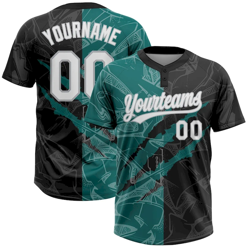 Custom Graffiti Pattern Black Teal-Gray 3D Two-Button Unisex Softball Jersey