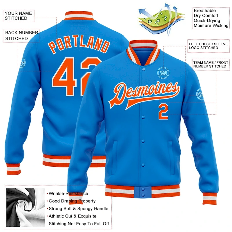 Custom Powder Blue Orange-White Bomber Full-Snap Varsity Letterman Jacket